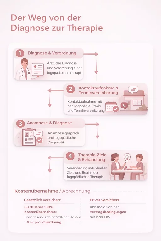 Ihre Ärztin oder Ihr Arzt (Kinder-, Haus-, HNO-, Zahnarzt, Kieferorthopäde oder Neurologe) diagnostiziert eine Sprach-, Sprech-, Stimm- oder Schluckstörung, verordnet eine logopädische Therapie und händigt Ihnen eine Heilmittelverordnung aus. Sie wählen daraufhin eine Praxis, mit der Sie Kontakt aufnehmen und einen Termin vereinbaren.
